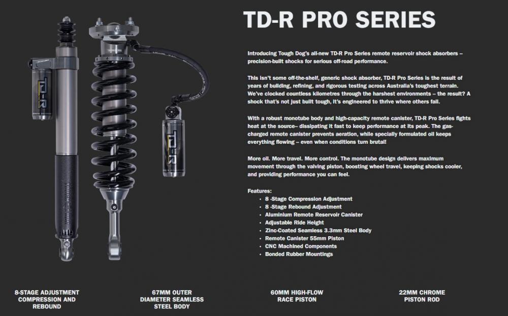 Řada TD-R Pro je výsledkem několikaletého vývoje a přísného testování v nejnáročnějším terénu Austrálie. Robustní jednotrubková konstrukce s vnějším průměru 67 mm, 60 mm pístem a 22 mm pístnicí zajišťuje spolehlivou funkci i tam, kde ostatní tlumiče již selhávají. Plynem plněná externí nádržka zabraňuje zavzdušnění, speciálně vyvinutý olej zvládá i vysoké teploty. Konstrukce zajišťuje odvod tepla, udržuje tlumiče chladnější a tím zajišťuje jejich funkčnost v extrémních podmínkách