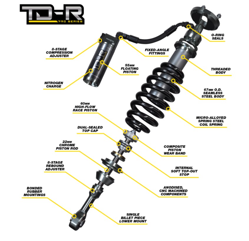 Řada TD-R Pro je výsledkem několikaletého vývoje a přísného testování v nejnáročnějším terénu Austrálie. Robustní jednotrubková konstrukce s vnějším průměru 67 mm, 60 mm pístem a 22 mm pístnicí zajišťuje spolehlivou funkci i tam, kde ostatní tlumiče již selhávají. Plynem plněná externí nádržka zabraňuje zavzdušnění, speciálně vyvinutý olej zvládá i vysoké teploty. Konstrukce zajišťuje odvod tepla, udržuje tlumiče chladnější a tím zajišťuje jejich funkčnost v extrémních podmínkách