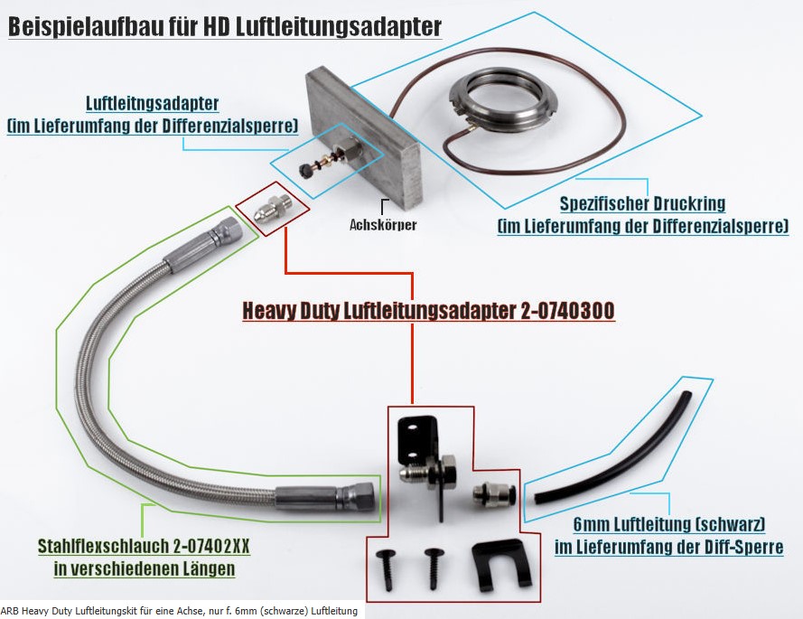 ARB sada pro montáž pancéřované hadice - pro zesílené vedení vzduchu k nápravě. Společně nahrazují sadu HDAL. Umožňuje propojit standartní plastovou hadičku se šroubením na nápravě. K této sadě je nutné dokoupit panceřovanou hadičku dle požadované délky : 0740201 0,3m / 0740202 0,5m nebo 0740203 1,0m. Hadice nejsou v balení u sady.