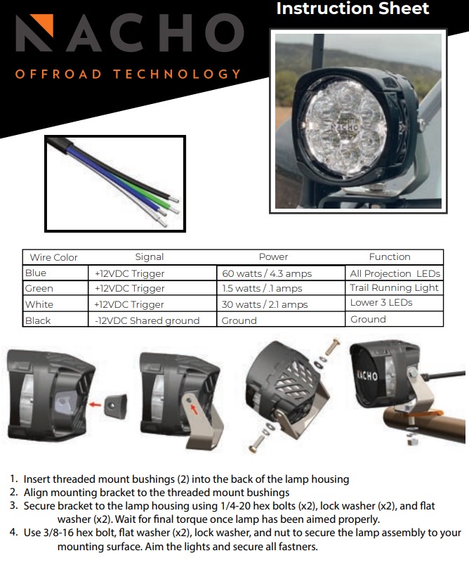 Světlomety NACHO Quatro Combo jsou navrženy tak, aby překonaly očekávání a nabourali formu tradičního off-roadového osvětlení. Každé balení obsahuje pár světel a jantarové a kouřové kryty. Kryty se snadno instalují vyjmutím původního krytu a umístěním požadovaného krytu do drážek a poté zaklapnutím krytu zpět na světlomet. Kryty vyrobené z polykarbonátového materiálu představují úroveň ochrany nebo rychlý způsob, jak změnit barvu výstupu světla.